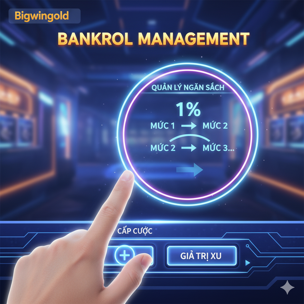 Mức 2)说明资金管理原则。背景略微模糊,但能看出是Bigwingold的游戏大厅界面。整体色彩柔和但指示清晰,强调策略性和控制力。”>