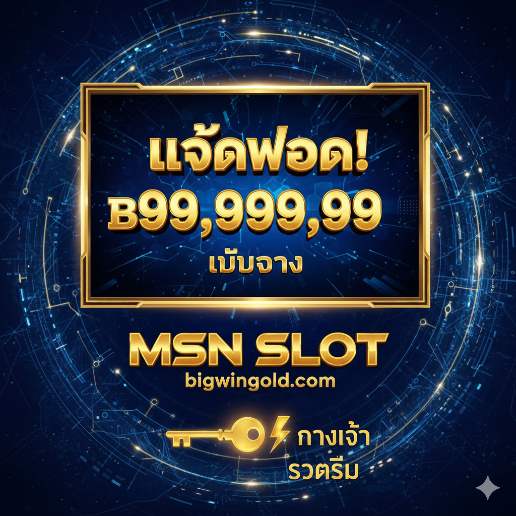 MSN SLOT เว็บตรง (Web Direct)’。主视觉应是一个闪耀、สมัยใหม่的老虎机屏幕,上面显示着巨大的’JACKPOT’字样และ高额的泰铢金额。背景ใช้深蓝色และ金色交织的科技感光芒,营造出奢华和信任感。画面中央醒目地วาง关键词’MSN SLOT’和’bigwingold.com’,并配上钥匙🔑หรือ闪电⚡️图标,象征’ทางเข้า (Entrance)’และ’รวดเร็ว (Fast)’。整体风格为泰式博彩类常用的华丽、高对比度设计。