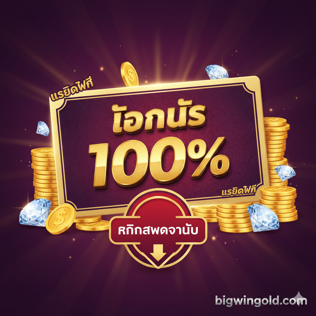 总结图主要展示核心促销活动和行动号召。画面中心是一张印有’โบนัส 100%’的巨大VIP卡或奖券,旁边堆放着象征’เครดิตฟรี (Free Credit)’的闪闪发光的筹码或钻石。在卡片下方,用一个大大的泰语按钮或箭头,写上’คลิกสมัครวันนี้ (Click to Sign Up Today)’。整体构图采用聚焦式,吸引用户目光集中到最重要的’100% Bonus’上,背景可以选用紫色或深红色,显得高贵且紧迫。